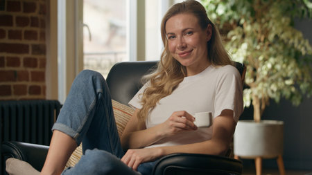 Relaxed Caucasian woman enjoying morning coffee drink smelling aroma beverage rest sitting at home looking at camera drinking tea peace comfort break indoors house