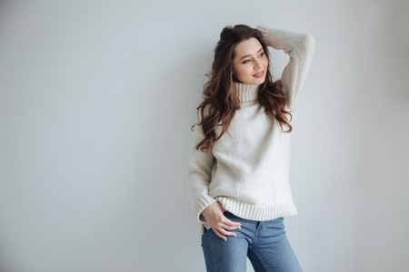 Beauty woman in sweater in studio. looking away. hand near the head. isolated gray background