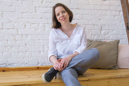 Contented young woman in a loose white shirt, trousers and sneakers sits on a wooden bench in a loft on white brick wall background. Woman is in a relaxed pose and smiling.