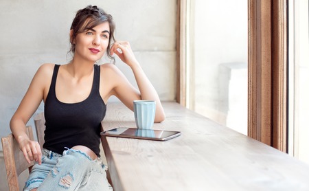 Indoor shot of thoughtful dark haired woman dressed in blue sweatshirt, jeans, sits on floor near bed, looks thoughtfully at window, poses in cozy bedroom at modern apartment. Domestic atmosphere