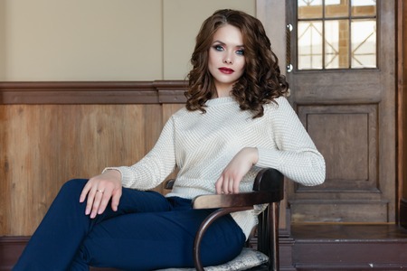 Attractive young woman with long curly hair posing in a white sweater, blue stylish trousers in a luxury interior and looking at you or in camera.