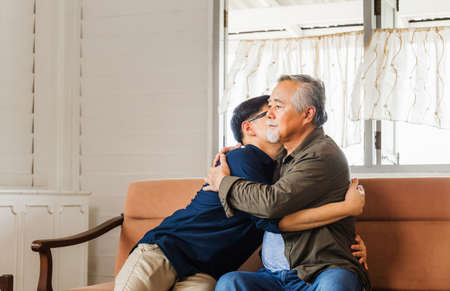 Senior asian father give advice adult son in living room, Happiness family concepts