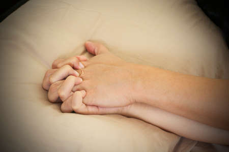 Mental Health Concept. Couple making Comfortable Hand Touch for Encouraging Together. Love and Care. Top View