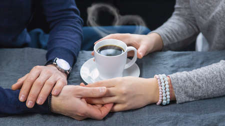 Close up view of couple holding hands, loving caring man supporting comforting woman, giving psychological support, help or protection, understanding in marriage relationships, reconciliation concept