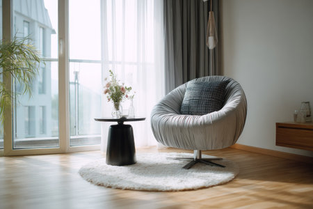 An interior photograph showcases a contemporary living space featuring a stylish armchair and a round rug. The scene is illuminated by natural daylight filtering through a large window, creating a bright and airy atmosphere. Suitable for a variety of purposes, including lifestyle blogs, editorial features, and marketing campaigns.