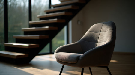 A stylish modern armchair bathed in natural light, positioned in a contemporary room with a chic wooden staircase, perfect for interior design inspiration.