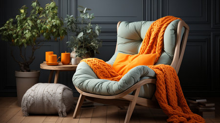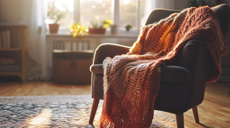 A cozy armchair draped with an orange blanket and textured pillow sits by a window, inviting warmth and comfort. Perfect for relaxation and tranquility.