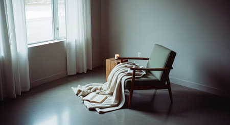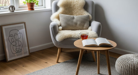 An inviting interior showcases an armchair adorned with sheepskin and a pillow. A small wooden table holds an open book and a beverage. Soft lighting and neutral colors create a comfortable atmosphere, suggesting a relaxing space. This image is suitable for various commercial uses, including lifestyle and home decor projects.