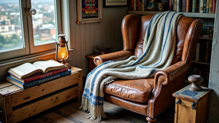 Cozy reading nook with leather armchair and blanketed books by window.