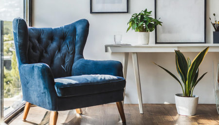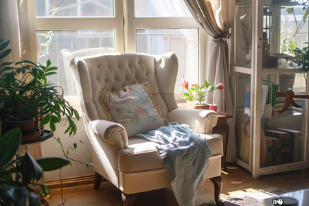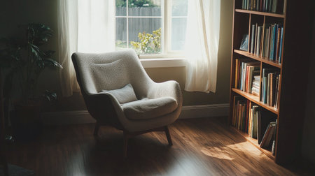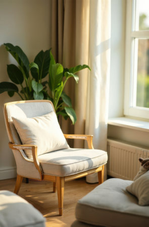 Sunlight illuminates a comfortable armchair placed next to a window in a cozy living room, creating a relaxing and inviting atmosphere perfect for unwinding