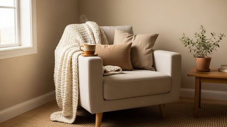 A warm and inviting interior scene a comfortable, neutral-toned armchair. A thick, cream-colored knitted blanket is draped over the back and arm of the chair, accompanied by several soft cushions in complementary shades of beige and tan. A steaming mug rests on a small saucer on the armrest, suggesting a moment of quiet relaxation. A small potted plant sits on a simple wooden side table next to the chair, and a textured rug covers the floor. Natural light streams in from an unseen window,...