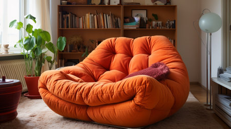 a sitting area featuring bright orange furniture in a whimsical, vintage academia style. the creased, crinkled, and wrinkled design adds a unique touch to the bulbous and functional pieces. the ambiance is zen-inspired, captured beautifully with the fujifilm natura 1600 film. ai generated