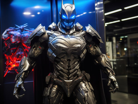 A detailed armored figure with a unique design is leaning against a vibrant wall in an urban space, capturing a blend of technology and art.