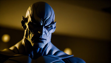 close up of a male cyborg robot in a dark room.