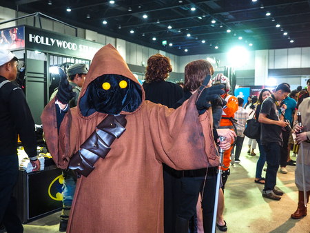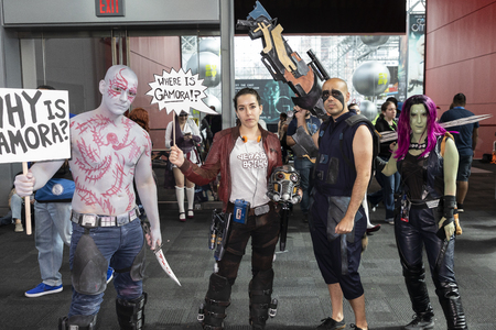 New York, NY, USA - October 9, 2015: Comic Con attendees pose in the costumes during Comic Con 2015 at The Jacob K. Javits Convention Center in New York City. The New York Comic Con is an annual New York City fan convention dedicated to comics, graphic no