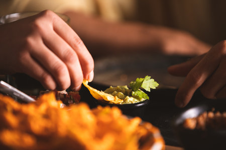 young woman dipping a nacho in guacamole with parsley. gourmet nachos. couple enjoying fast food.