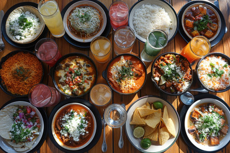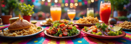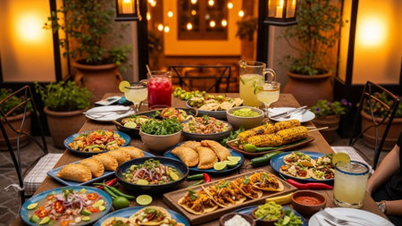 Colorful mexican street food feast with tacos, salad, and drinks on a festive table. That the image is generated using AI.