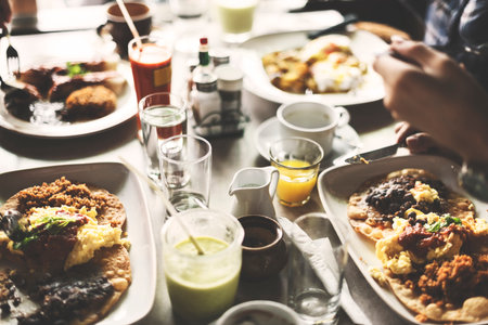 Top view of group of people having dinner together while sitting at the wooden table in the restaurant. Cinco De Mayo, national holiday of Mexico.