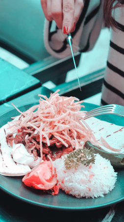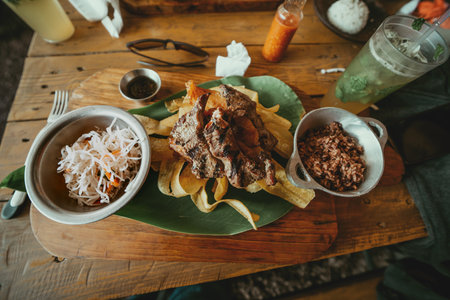 Traditional roast beef with slices of banana and gallopinto served on a wooden table. Wooden table with traditional roast meats and gallopinto