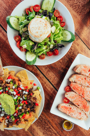 Vertical photo of a goat cheese salad, nachos with guacamole and meat and bread with tomato on a wooden table