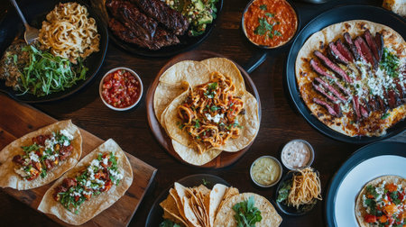 Top-down view of a dark wood table laden with delectable dishes such as pastas, flatbreads, tacos, and steak, perfect for a restaurant theme.