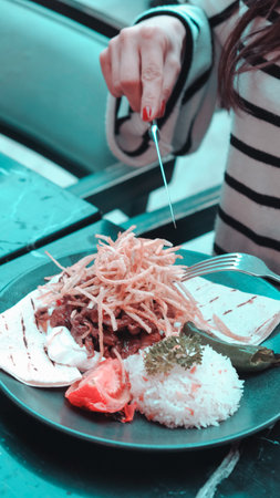 Top-down view selective focus close-up of blogger taking photos of delicious beef steak with bread and vegetable side dish on smartphone camera