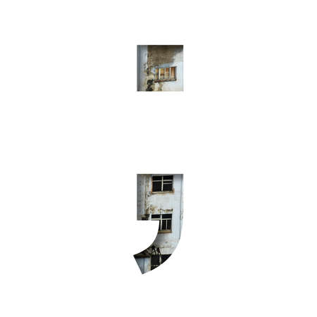 Font on an abandoned industrial building. Punctuation marks dot and comma cut out of paper on a background of windows and doors of an abandoned industrial building. Set of decorative fonts.