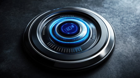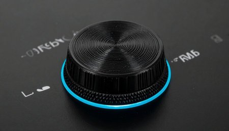 A close-up of a sleek, metallic control dial glowing with a cool blue LED light.