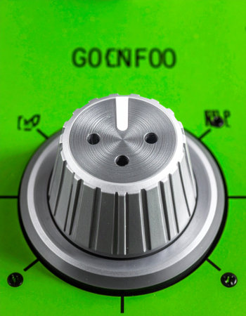 This closeup shows a shiny metal control knob. Button knob on maximum highest position. Concept of high level of something