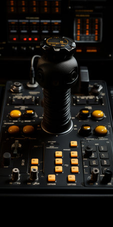 A panel filled with tactile buttons and a touchscreen where an operator manages various IoT devices demonstrating the intuitive control facilitated by enhanced 5G network capabilities