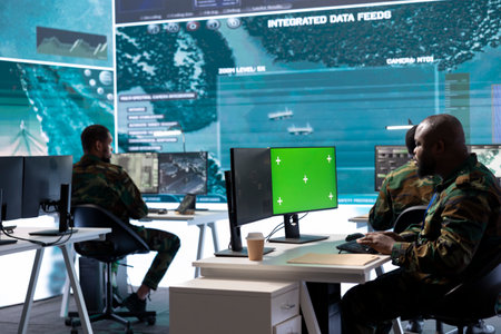 Professional IT engineer examines reconnaissance imagery and mockup screen, working with military satellite information for defense mission. Serviceman helping with national safety.