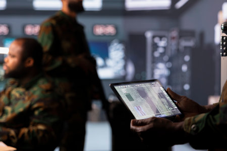 Military operator monitoring enemy aerial attacks using digital device. Army soldier in headquarters maintains air space superiority with radar on tablet during armed conflict, close up