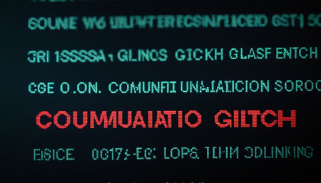 A close-up view of a dark screen displaying lines of text. The majority of the text is in a pale green color, appearing as digital characters. One prominent line of text in the center is in a bright red color and reads COMMUNICATION GLITCH. The red text is pixelated and appears to be distorted, suggesting a digital error or malfunction.