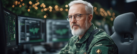 Military officer leads cybersecurity efforts in a high tech control center, ensuring data protection and managing surveillance systems, Coordinating national security operations.