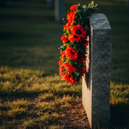 Poppies left at a memorial during a Rememberance Day Service Vintage Retro Filter.