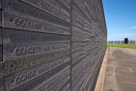 Canberra, ACT, Australia - Sept 1 2018: poppy decoration next to the wall of fallen soldiers at the Australian War Memorial - Lest we forget, Remembrance of war losses.
