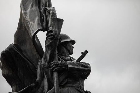Bucharest, Romania - February 21, 2020: Soviet soldier statue at the Red Army Cemetery in Bucharest during a cold and rainy winter day.