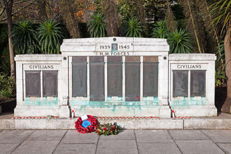 Weston-super-Mare, UK - November 15, 2014: The war memorial in Grove Park showing the names of service personnel and civilians killed in World War II.