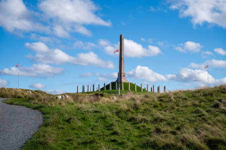 Haraldshaugen, Haugesund, Norway, tall monument stands on a grassy hill, surrounded by evenly spaced pillars, with sheep grazing nearby and flags flying on poles