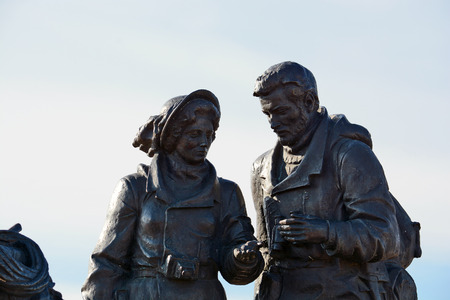 Lochander, Scotland - June 11, 2012: Closeup of three soldier heads at green-gray bronze Commando Memorial statue along A82 and near Spean River under cloudy sky.