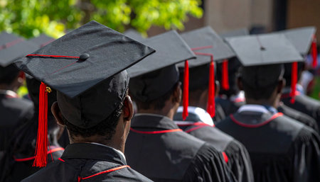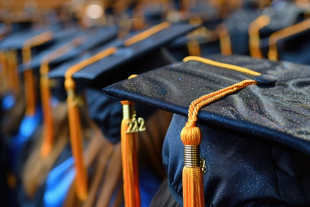 A high-angle shot features graduates in black graduation caps with golden tassels, symbolizing academic achievement, signifying graduation day success and the culmination of hard work.