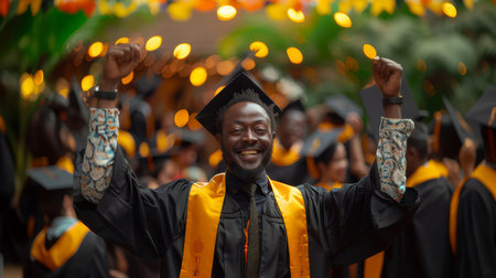 Happy African graduate celebrating at commencement ceremony, wearing traditional graduation gown and cap, with arms raised in joy amidst fellow graduates.