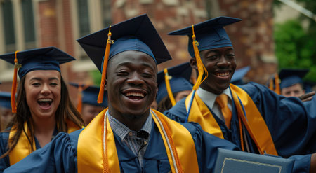 Happy graduate Happy African man in graduation gowns holding diploma and smiling while his friends standing in the background : Generative AI