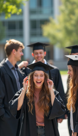 A cheerful young woman in a graduation cap and gown beams with joy as she celebrates with her friends outdoors. The scene captures the essence of achievement and camaraderie, showcasing the excitement of graduation day amidst a backdrop of greenery and happiness