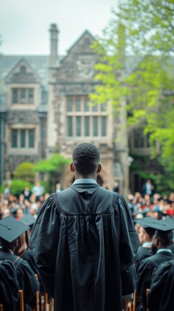 Triumphant milestone! Black college grad in cap and gown. Inspiring achievement captured. Celebrate success.