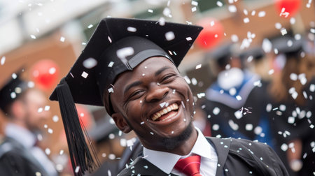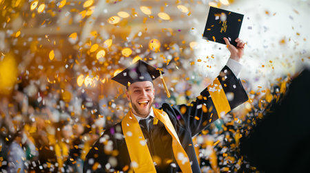 Joyful graduate cheers as colorful confetti falls during a memorable ceremony, celebrating their significant academic achievement and inspiring journey
