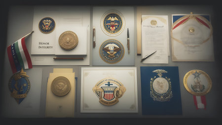 A collection of medals and ribbons are displayed on a table. The ribbons are of various colors and sizes, and some of them have a star on them. Scene is one of pride and accomplishment