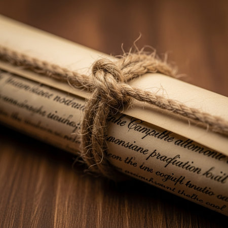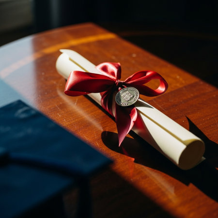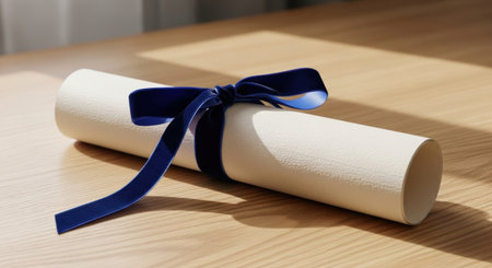 A rolled up diploma or certificate tied with a blue velvet ribbon resting on a light wooden table with sunlight and shadows. Represents academic achievement and graduation success.