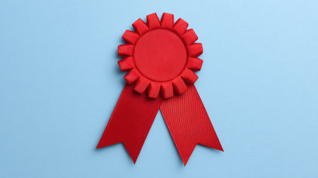 A vibrant red ribbon award emblem set against a soft blue background, symbolizing achievement and recognition for exceptional accomplishments. Perfect for celebration themes and award presentations.
