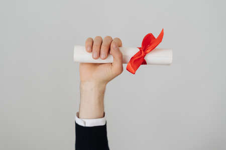Male hand hold graduation bachelor diploma with a red bow on white background